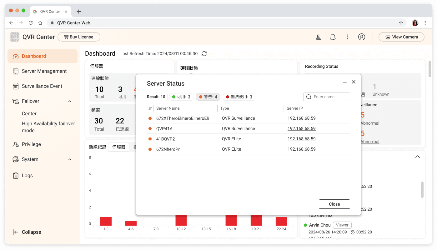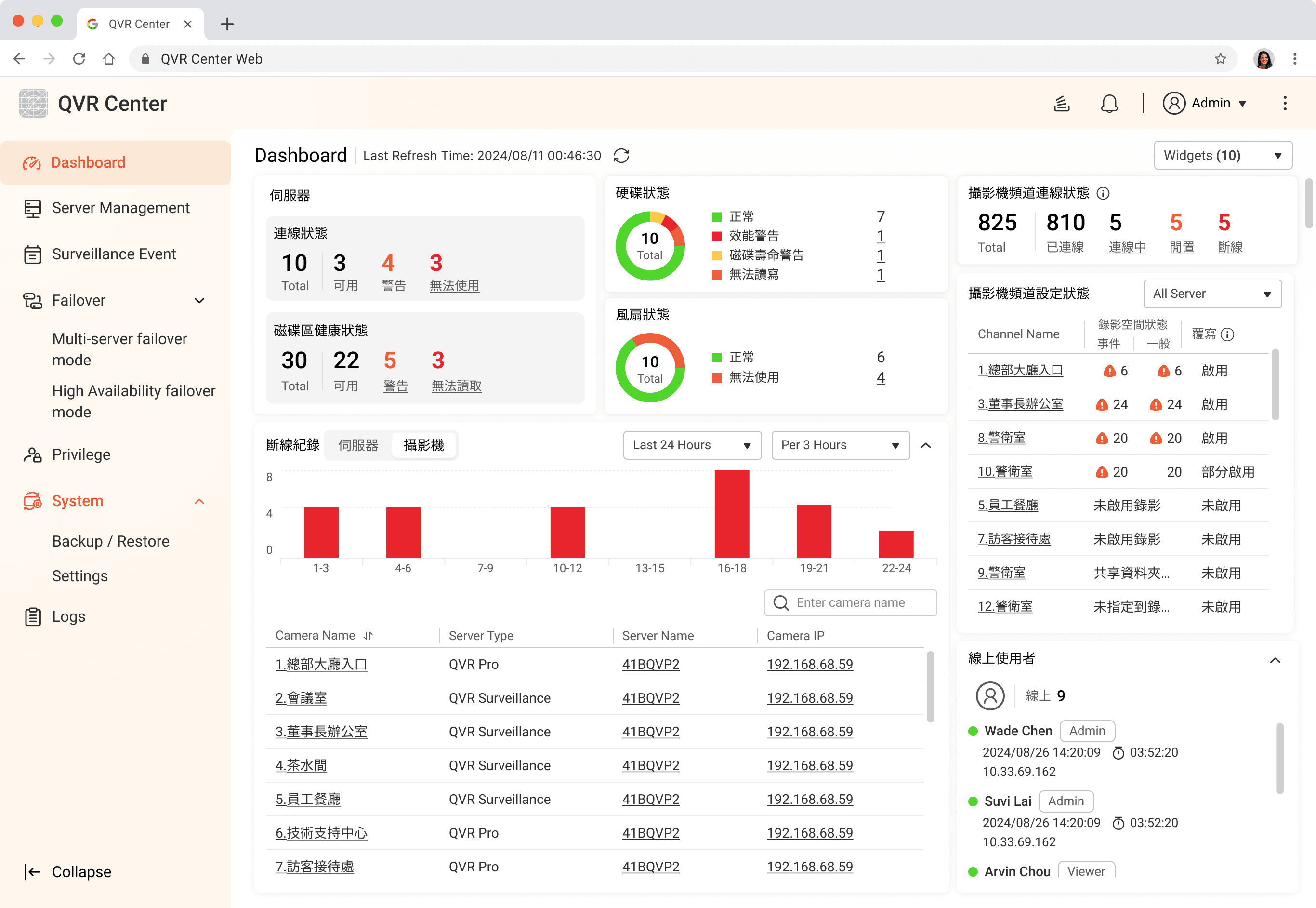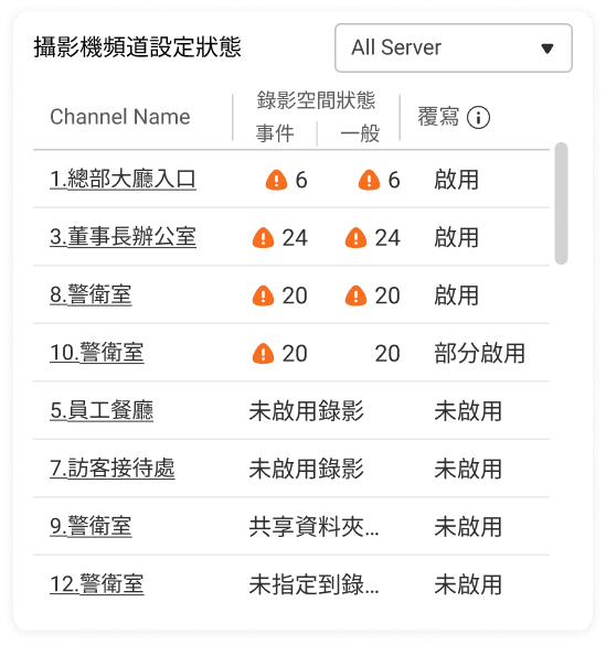 在 Camera / Channel 區塊中,不再平均呈現所有設備,而是優先列出有問題的頻道,並以警示圖示與排序強化異常可見性。以能避免使用者在大量正常設備中搜尋異常項目。