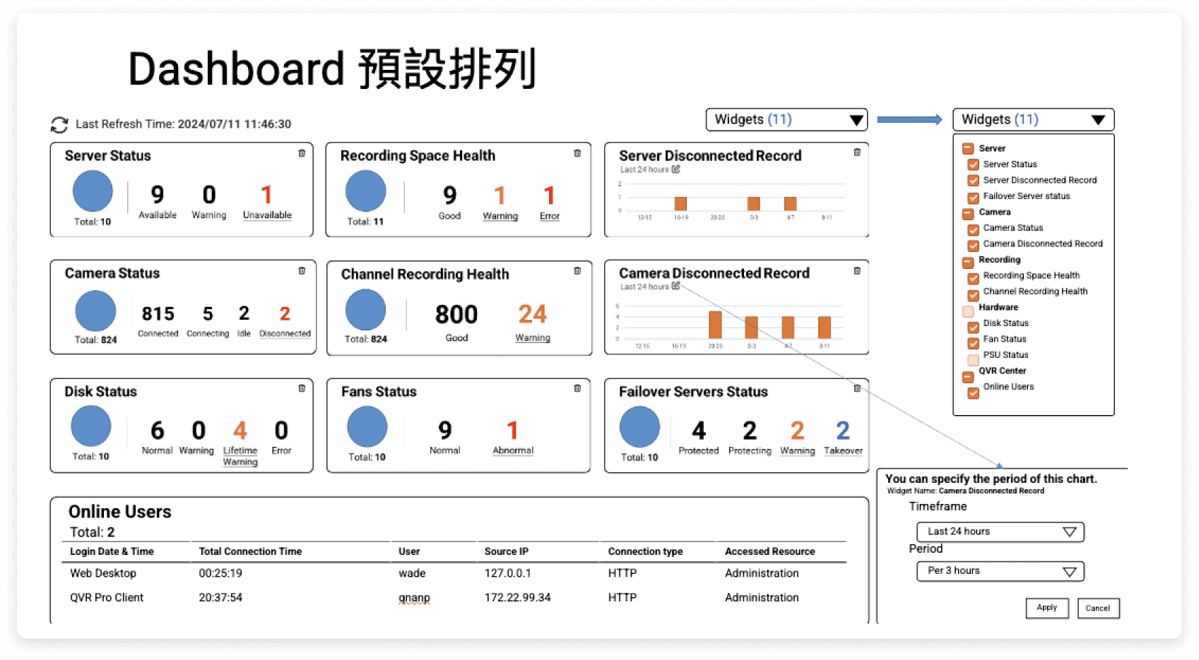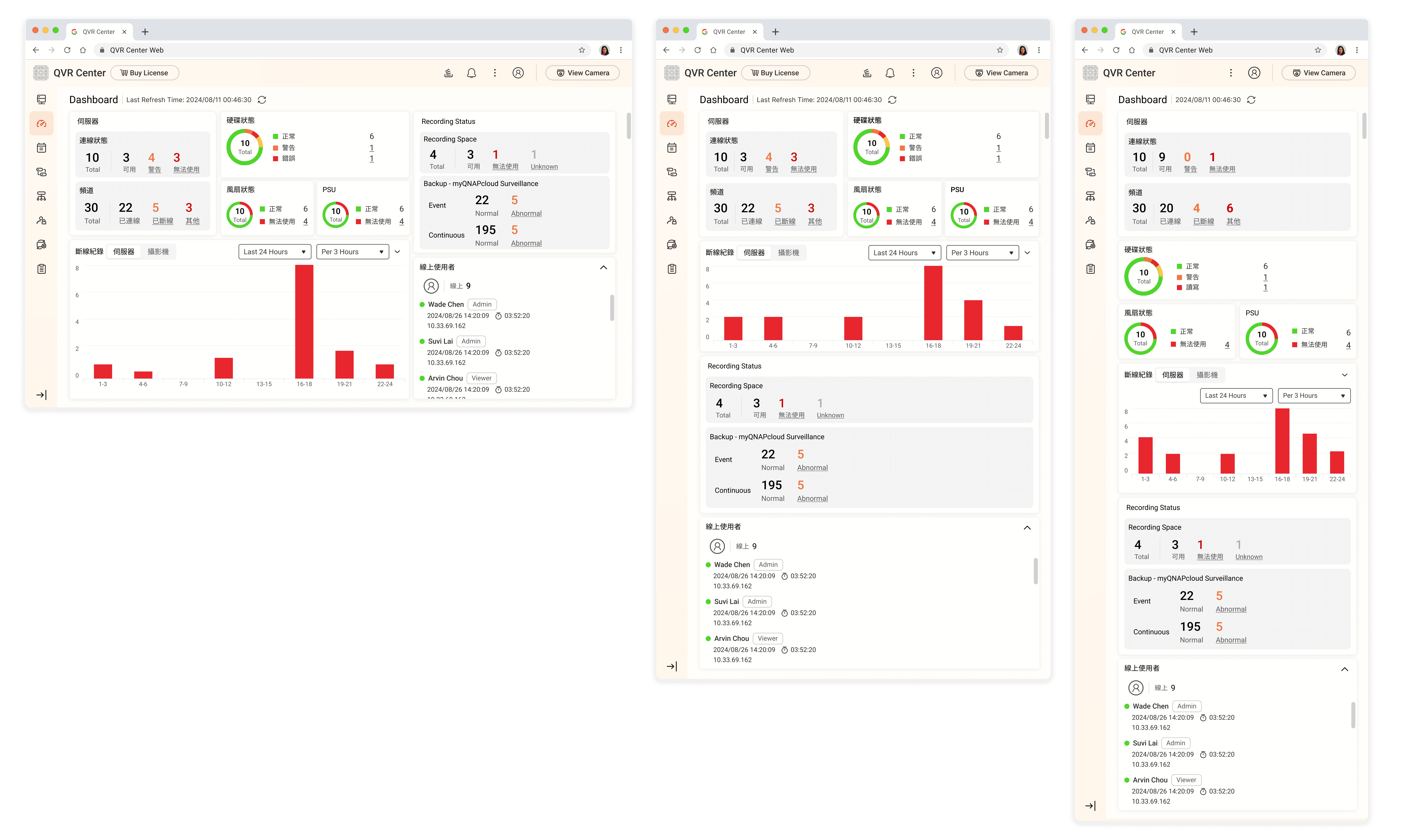 QVR Center 是一套監控中控軟體。原有 Dashboard 主要因應特定客戶情境設計,缺乏適用於一般使用者的通用型 Overview Dashboard。此次專案的目標,是重新整理首頁資訊架構,建立一套能支援多數使用情境的通用版 Dashboard。